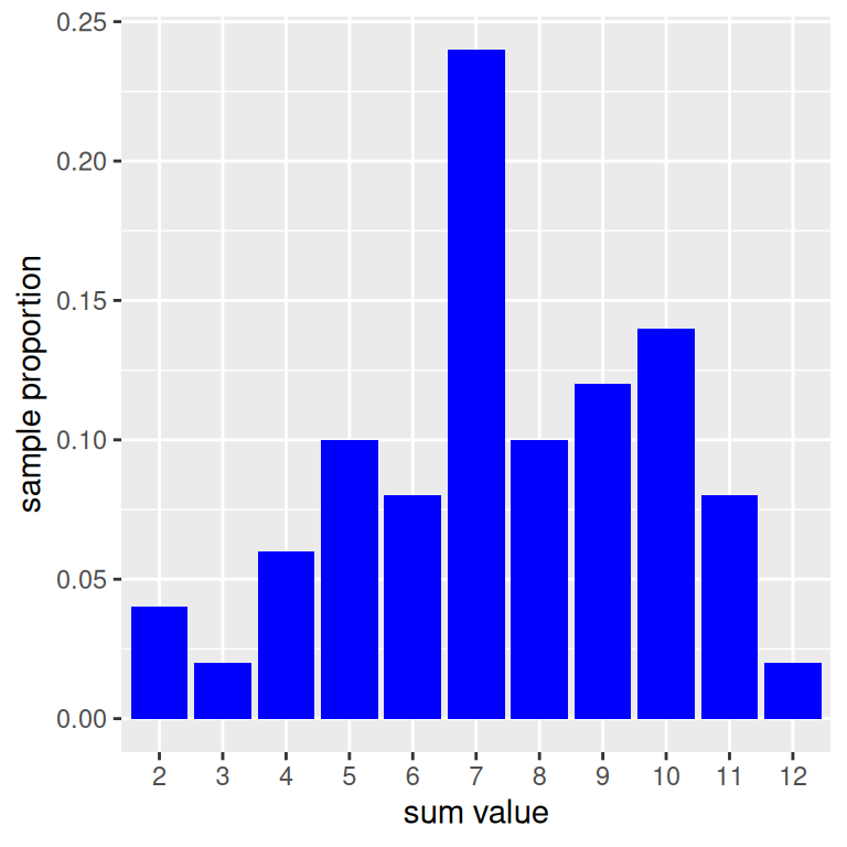 Let’s simulate rolling two die and and computing a sum fifty times Then, we can make a data frame out of our results and find the total amount of rolls, grouped by face. This can be done with the n() summary function– and if we divide by 50, we can get the sample proportions of each sum.