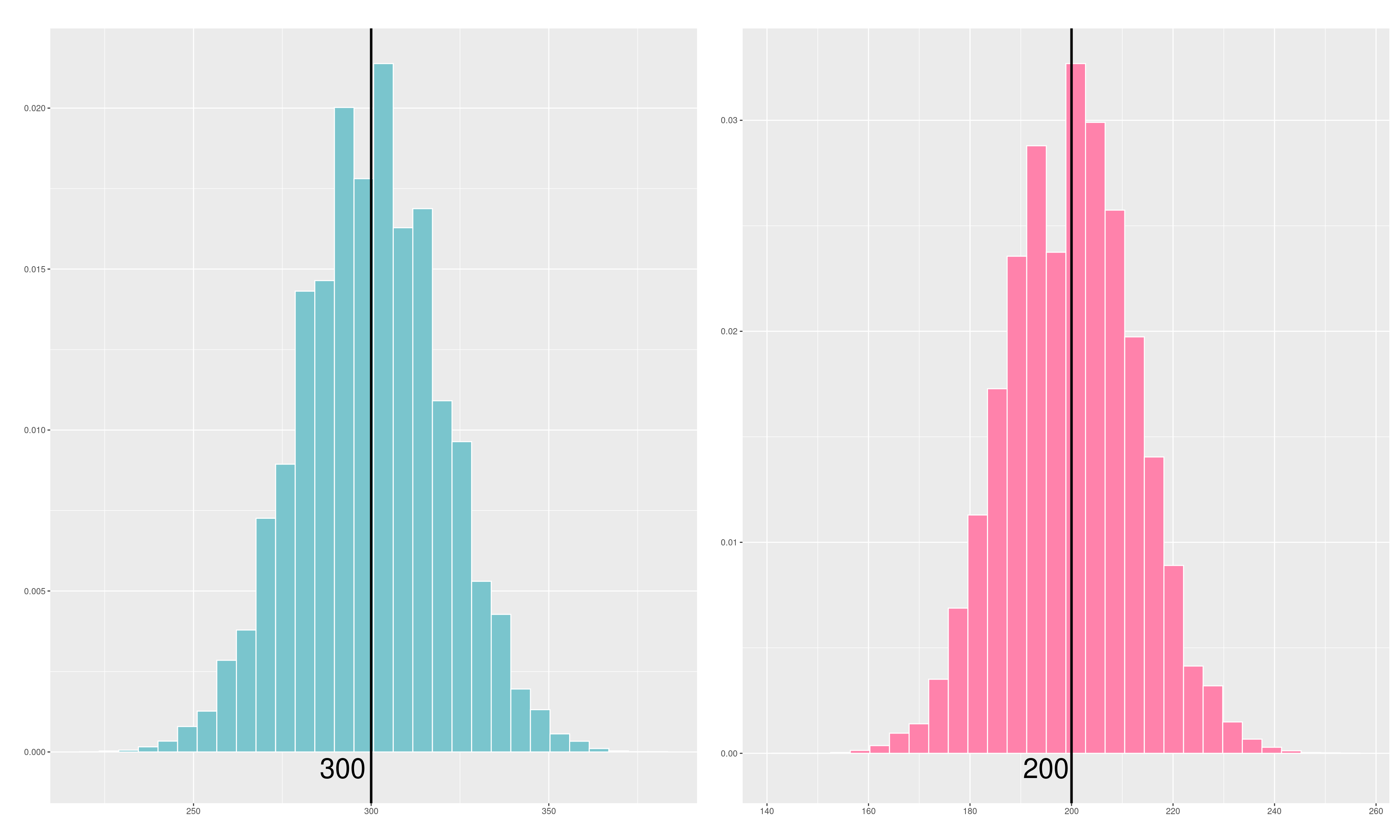 We take the sum of 100 iid random variables for each of \(X\) and \(Y\), called \(SX_{100}\) and \(SY_{100}\). The empirical distributions of \(SX_{100}\) and \(SY_{100}\) are plotted below.