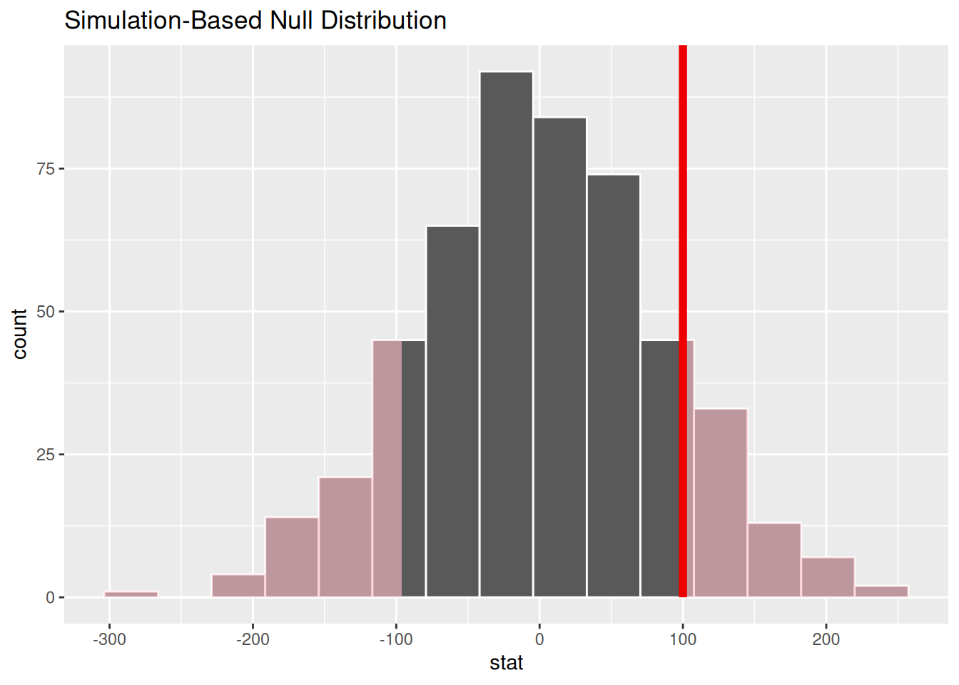 visualize() expects a data frame of statistics.++.shade_p_value() is a function you can add to shade the part of the null distribution that corresponds to the p-value. The first argument is the observed statistic, which we’ve recorded as 100 here to see the behavior of the function. direction is an argument where you specify if you would like to shade values "less than" or "more than" the observed value, or "both" for a two-tailed p-value.