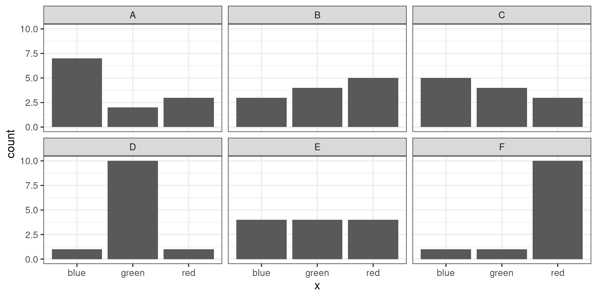 Which pair of plots would have the greatest chi-squared distance between them? (consider one of them the “observed” and the other the “expected”)