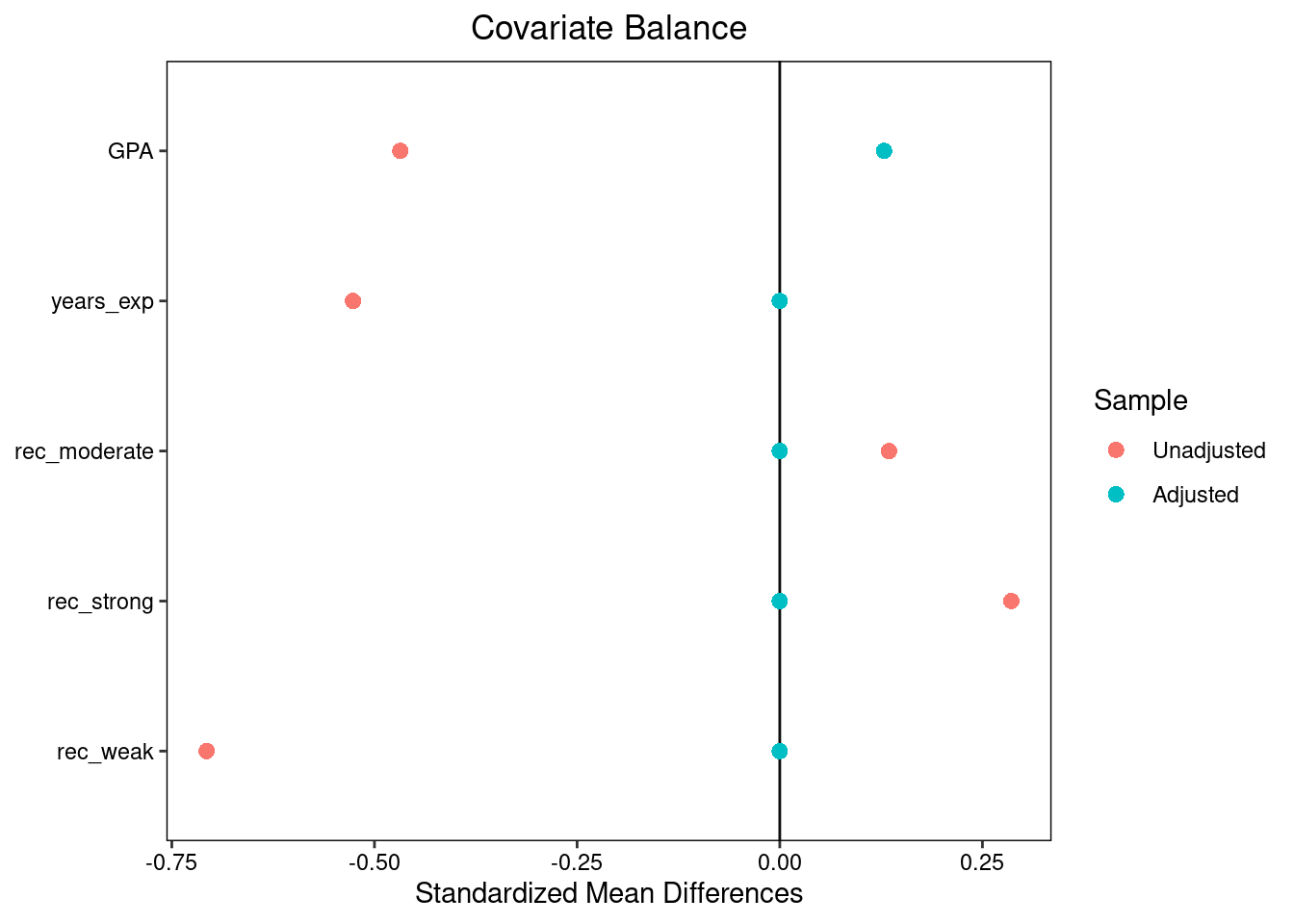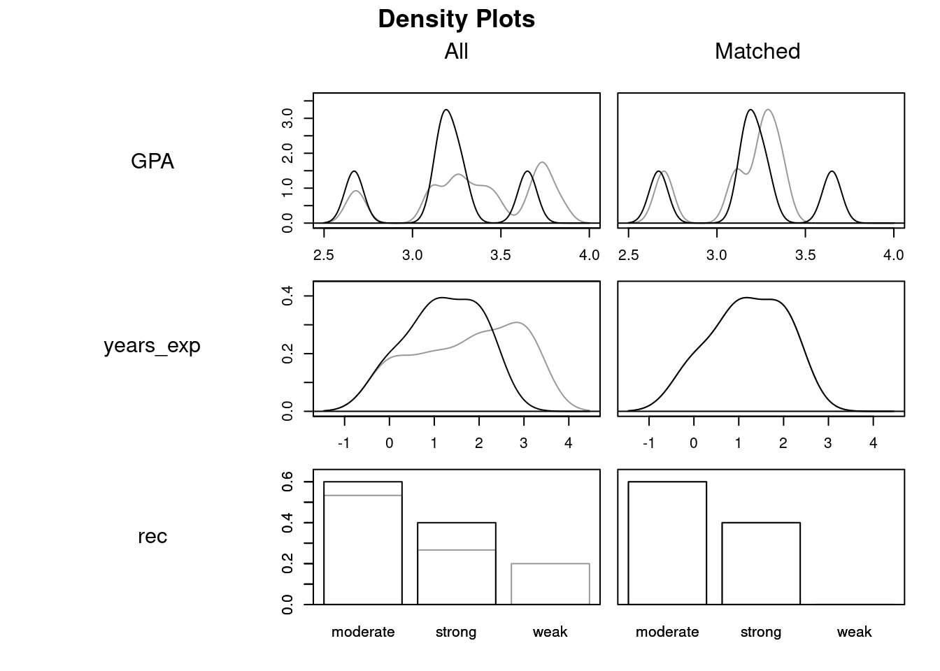 grad_matched <- matchit(cal_grad ~ GPA + years_exp + rec, method = 'optimal',